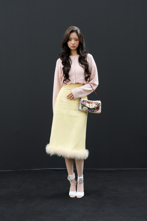 레이는 로맨틱한 레이스 디테일의 가디건과 크레이프 소재의 스커트, 로즈 디테일이 포인트인 드립 로즈 샌들에 발렌티노 가라바니 소프트 베인 백을 더해 부드러우면서도 우아한 아름다움을 자랑했다.