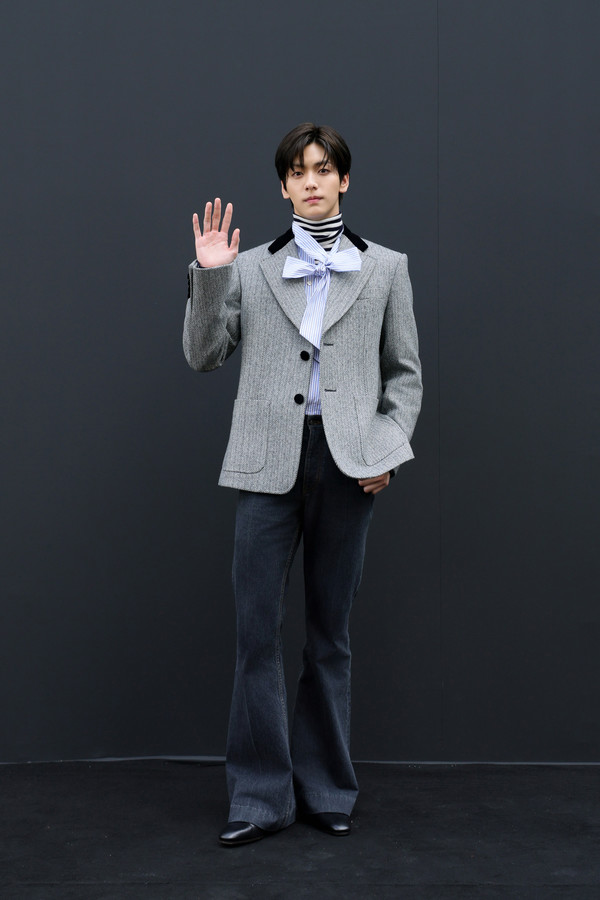 수빈은 메종의 테일러링이 돋보이는 재킷에 스트라이프 패턴의 니트웨어, 보우 디테일 셔츠, 유연한 실루엣의 블랙 데님 팬츠를 매치해 모던하면서도 감각적인 룩을 완성했다.